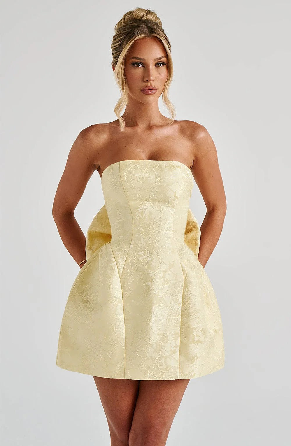Blessin Fiyonklu Mini Elbise ile gecenin ışıklarını üzerine çek. Straplez kesimi ve göz alıcı büyük fiyonk detayı, her adımda zarafetinizi vurgular. Sarı, pembe, açık mavi ve beyaz renk seçenekleriyle, bu mini elbise özel anlarınız için vazgeçilmez bir parça olacak. Topuklu ayakkabılar ve minimal takılarla kombinleyerek sofistike bir görünüm yaratabilirsin.